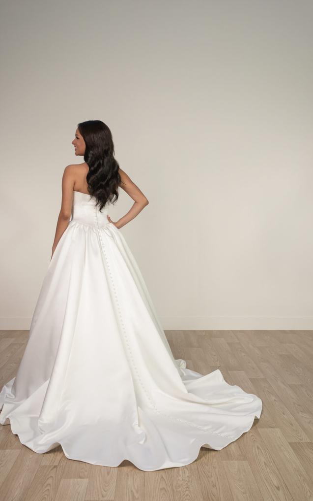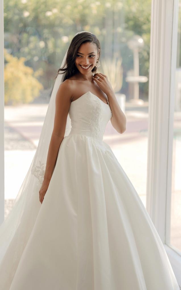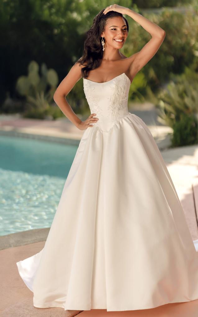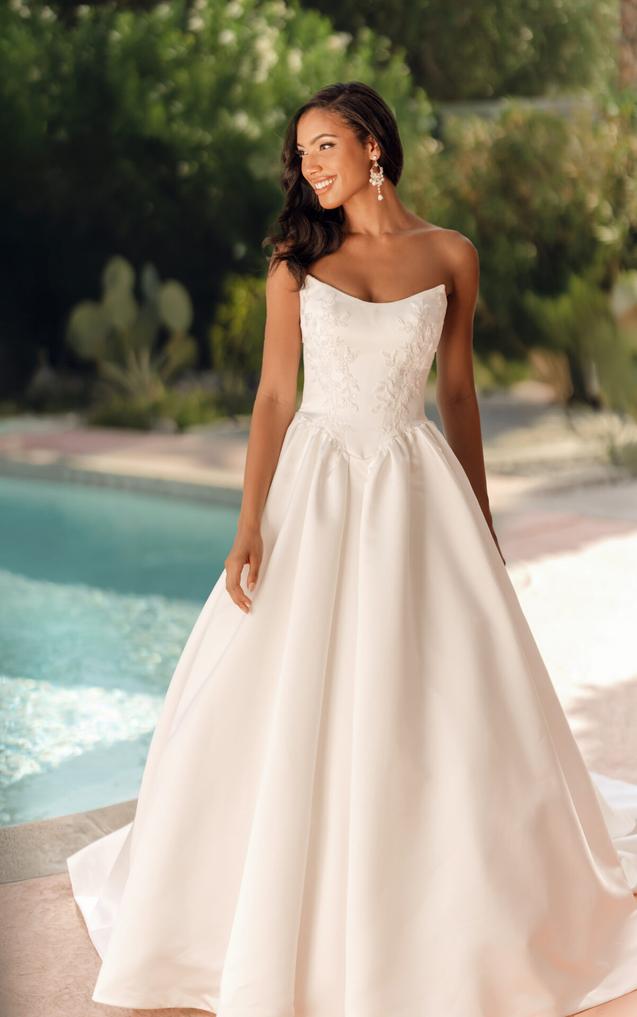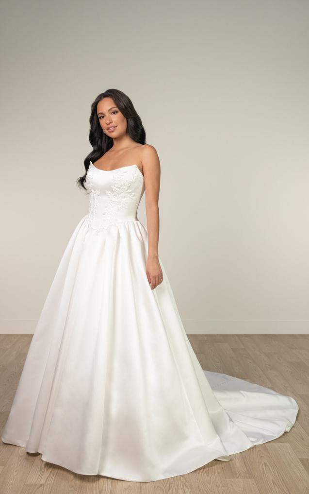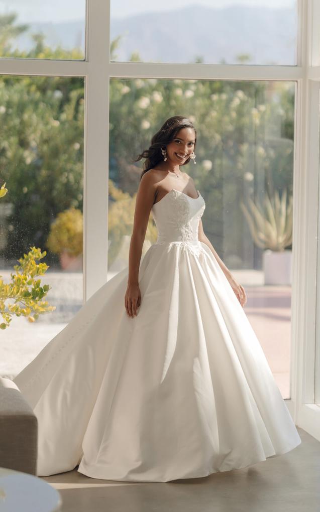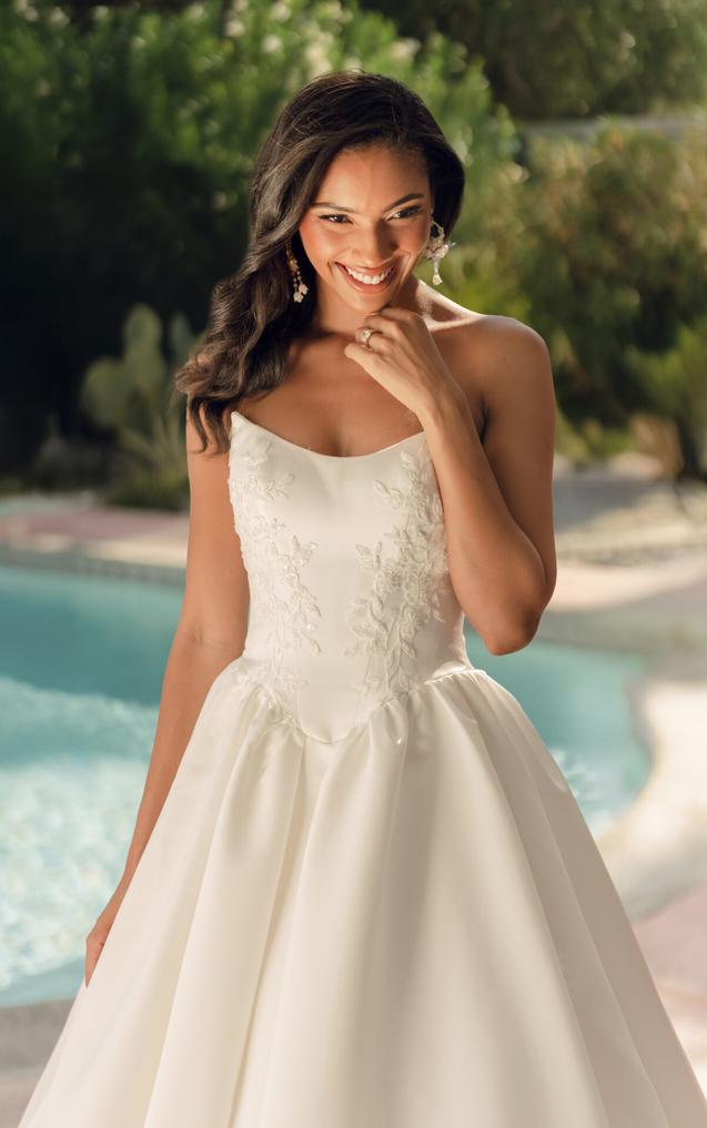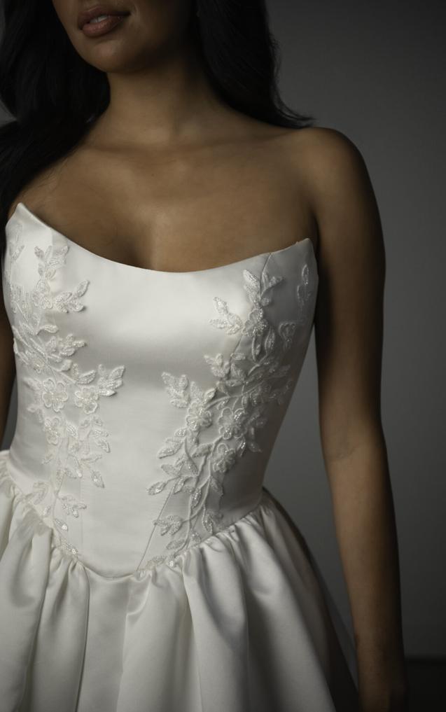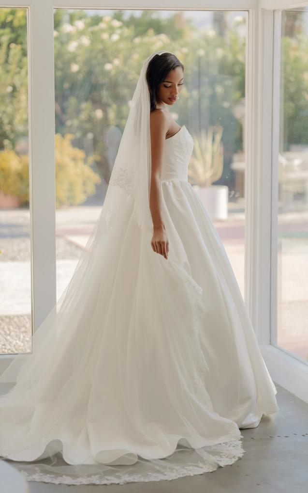 (COMING SOON!) This lace and satin gown features a chic scooped cat-eye neckline and expertly place seaming. The bodice accentuates the natural hourglass shape, while the defined basque waist and sculpted pleats unfold into a full, voluminous skirt.