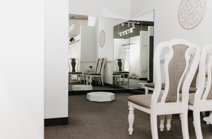 When designing the layout of Raffiné Bridal, the first thing to be decided was the bridal fitting and viewing areas. When a bridal appointment is scheduled, each bride is assigned to their private fitting and viewing area, not shared by other customers in the store. The private viewing areas all feature a three-way-mirror and seating for guests.
